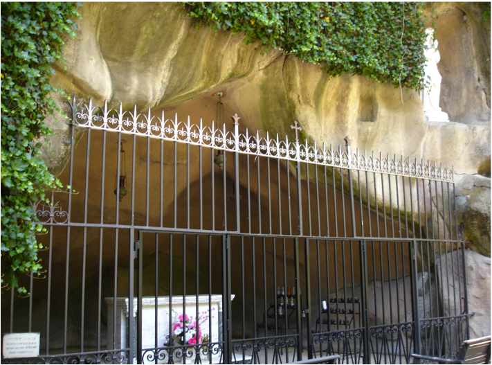 The Our Lady of Lourdes Grotto in Washington, D.C. at the Franciscan Monastery of the Holy Land in America was originally created in 1899. The grotto is a replica of the grotto in Lourdes, France where the Marian apparitions took place. It is located in the gardens of the monastery, secluded from the other areas to allow for quiet prayer and reflection time. Since it was created in 1899, it has been redesigned several times in order to accommodate more visitors, to make the grotto look more like the grotto in Lourdes, and to add the statues of Mary and the St. Bernadette.1 Mount Saint Sepulchre Franciscan Monastery. (2007). Virtual Tour. Retrieved from www.myfranciscan.org/VirtualTour.htmlAt first, the Mary statue was visible within the rock façade all year round, while the St. Bernadette statue was only displayed from 11 February to 16 July, the time period in which St. Bernadette received her visions from Mary.2 Rebsomen, André. 1926. Notre Dame de Lourdes; album du pélerin. Paris, France: Editions Spes.Many of the pilgrims who visited the Franciscan Monastery asked the monks to keep the St. Bernadette statue with the grotto all year long, so now the statue is out at all times (figs. 1-2).