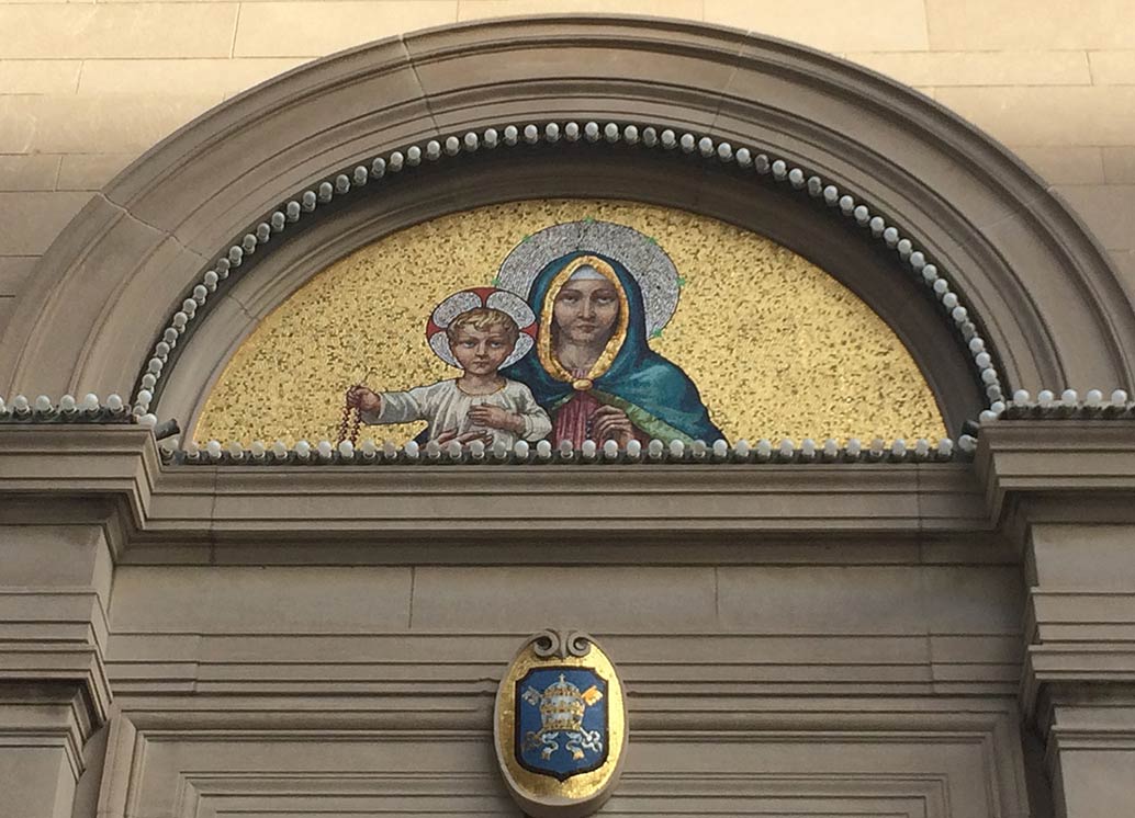 The Holy Rosary Church was founded in 1913 as a parish of Italian immigrants, and continues to serve the Italian-American community in Washington, D.C. The founder of the parish, Father Nicholas De Carlo, had been seriously ill prior to his ordination as a priest in Italy, and vowed to build a church in honor of the Blessed Mother in thanks for his recovery.1 Mary Elizabeth Brown, An Italian American Community of Faith: Holy Rosary in Washington, D.C. 1913 – 2003 (New York: Center for Migration Studies, 2004), 18-19.The new parish originally met in a converted house on H Street, until the construction of the present church was completed in 1923 and dedicated to Our Lady of the Holy Rosary (fig. 1). This title comes from the 13th century vision of St. Dominic, in which Mary gave him a rosary as a tool of prayer and safeguard against heretics.2 Butler’s Lives of the Saints: New Full Edition, vol.10, October (Tunbridge Wells: Burns and Oats, 1997), 43-44.