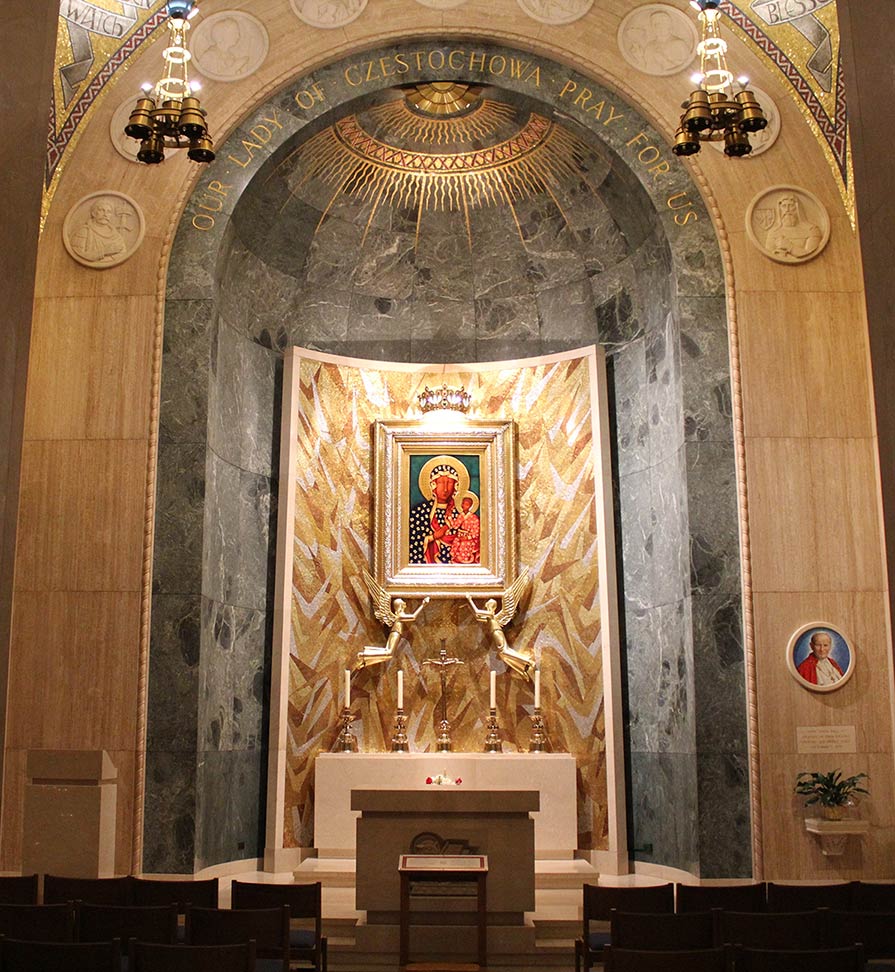 When entering through the main doors of the Upper Church, the Chapel of Our Lady of Czestochowa is the third major chapel on the left. The most revered aspect of the chapel is the replica of the icon of Our Lady of Czestochowa on the back wall behind the altar (fig. 2). The original icon is located in Czestochowa, Poland, in a basilica on top of Jasna Góra hill. It is a source of great devotion in Poland and is to this day a major pilgrimage site. Legend dictates that the original image was painted by St. Luke, one of the four writers of the Gospels in the New Testament of the Bible and one of the twelve hand-picked followers of Jesus. Legend also dictates that St. Luke painted on a canvas that was wrapped around the wood of the table of the Holy Family. Conversely, historians date the icon to the Byzantine period in the sixth or seventh century, its place of origin being Constantinople.2 New Catholic Encyclopedia, Vol. 5 2nd ed. (Gale, 2003) Page 488 s.v. “Czestochowa”.